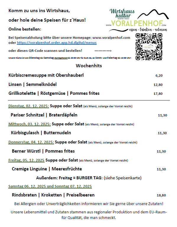 Die Wochenkarte für die KW 49 ist da. Komm zu uns ins Wirtshaus oder hole deine Speisen für z’Haus!