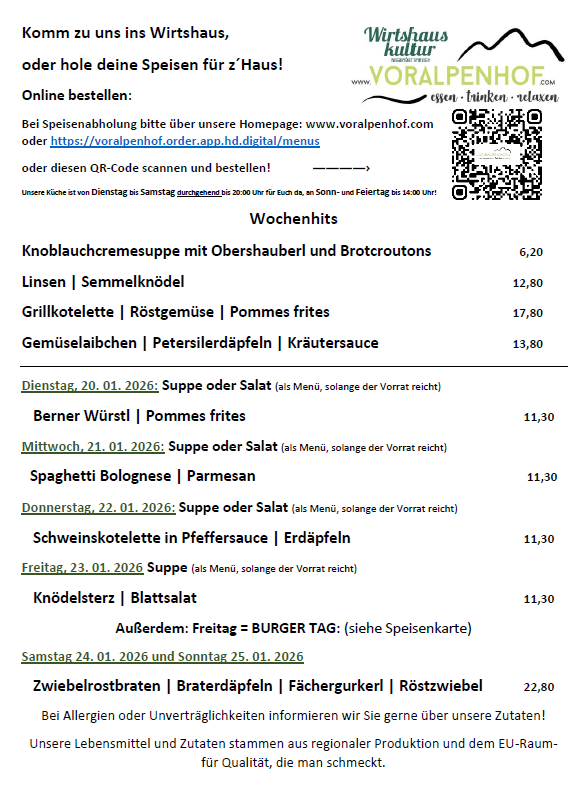 Die Wochenkarte für die KW 04 ist da. Komm zu uns ins Wirtshaus oder hole deine Speisen für z’Haus!