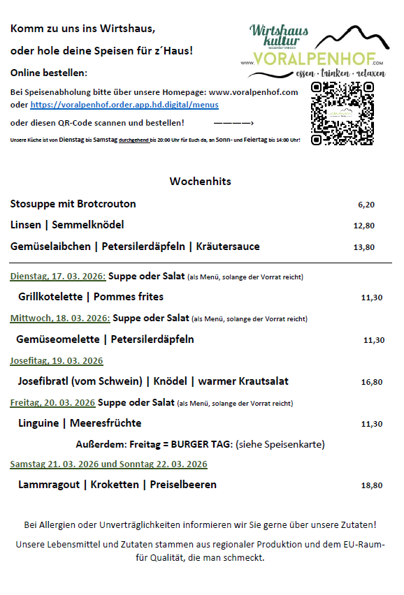 Die Wochenkarte für die KW 12 ist da. Komm zu uns ins Wirtshaus oder hole deine Speisen für z’Haus!