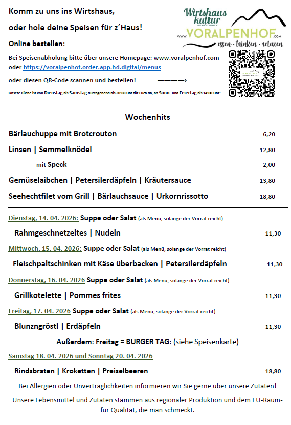 Die Wochenkarte für die KW 16 ist da. Komm zu uns ins Wirtshaus oder hole deine Speisen für z’Haus!